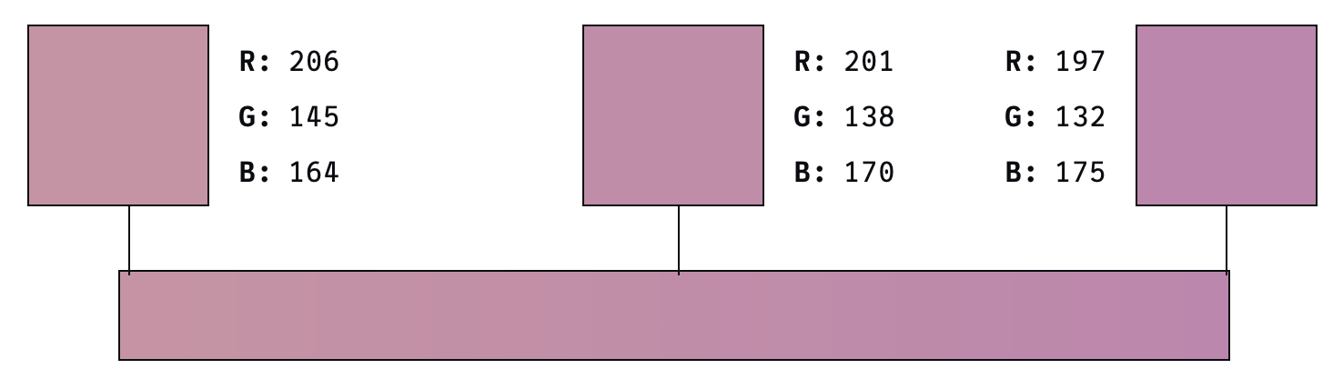 0/0/0 50/50/50 128/128/128 220/220/220 CSS 선형 그라데이션 알고리즘은 RGB 색상 체계에서 빨강, 초록, 파랑의 세 가지 색 채널 각각에 대한 산술평균으로 스펙트럼을 따라 모든 픽셀에 대한 특정 색상 값을 계산한다.