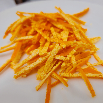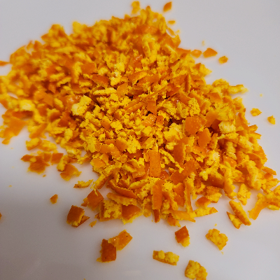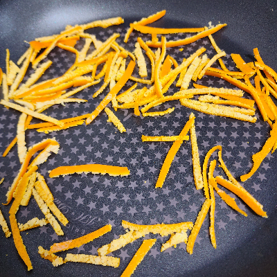 수분을 없애고 다진 귤피 그 후에 뜨거운 팬에 기름 없이 살짝 볶는다.