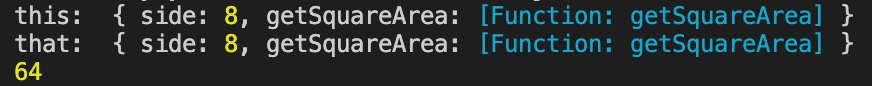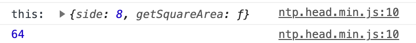 const square = { side: 8, getSquareArea() { console.log('this: ', this); return this.side ** 2; }, }; console.log(square.getSquareArea()); // 64