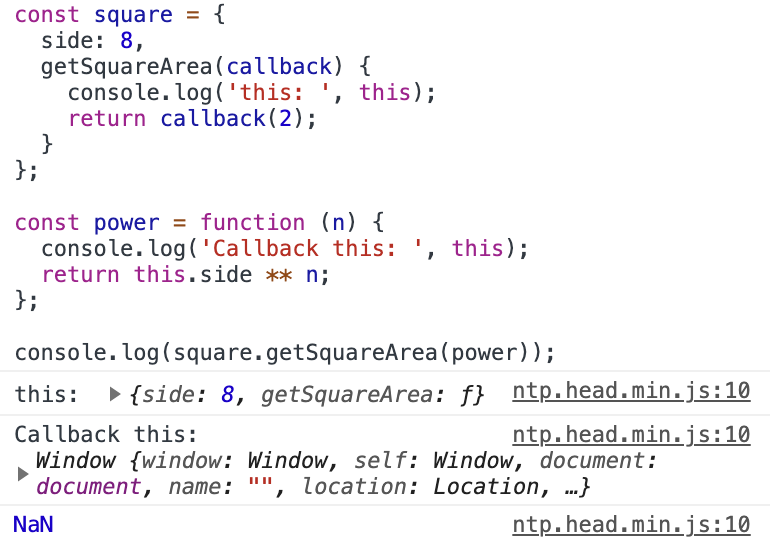 const square = { side: 8, getSquareArea(callback) { console.log('this: ', this); const that = this; return callback(that, 2); } }; const power = function (that, n) { console.log('that: ', that); return that.side ** n; }; console.log(square.getSquareArea(power));