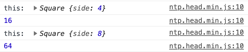const Square = function (side) { this.side = side; }; Square.prototype.getSquareArea = function () { console.log('this: ', this); return this.side ** 2; }; const square1 = new Square(4); const square2 = new Square(8); console.log(square1.getSquareArea()); console.log(square2.getSquareArea());