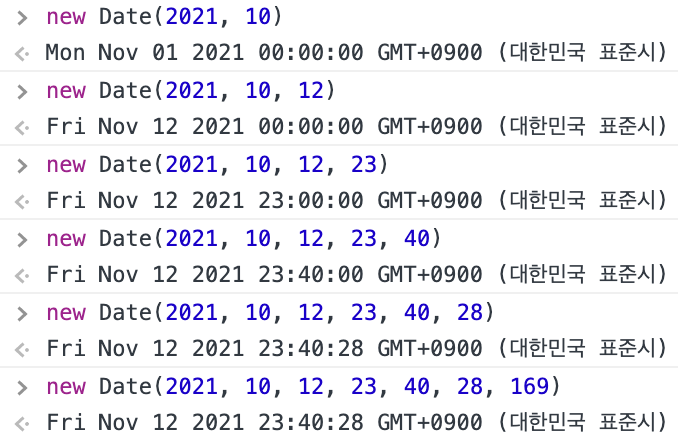 3) 전달하는 인수가 2개 이상이라면 전달되는 인수의 순서대로 년, 월, 일, 시, 분, 초, 밀리초를 각각 날짜 및 시각으로 가지는 Date 객체를 반환한다. 이때 처음 두 개의 인수, 즉 년과 월의 인수는 필수로 전달해야 하며 나머지는 순서대로 옵션으로 전달할 수 있다.